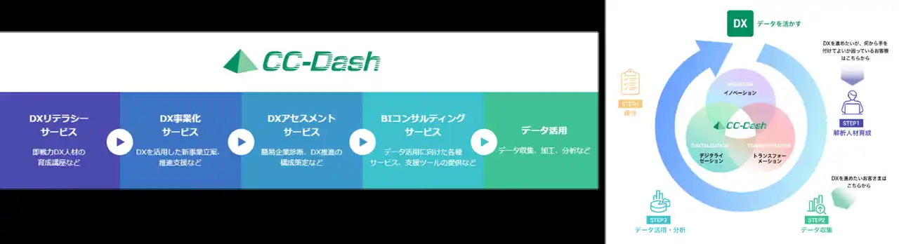 「CC-Dash」( https://xcc-dash.jp/ )は、データ活用によってお客様のDX推進を支援する当社独自のフレームワークです。DXを推進する際の各フェーズ(1.知る 2.つくる 3.集める 4.整える 5.分析する 6.活かす)における様々な課題に対し、テンプレート化と各種コンサルティングサービスをお客様に提供しています。加えてアライアンス等によってソリューションサービスのラインナップを随時追加・拡充していくことで、お客様のDX推進状況に合わせた支援策をワンストップで提供してまいります。 |