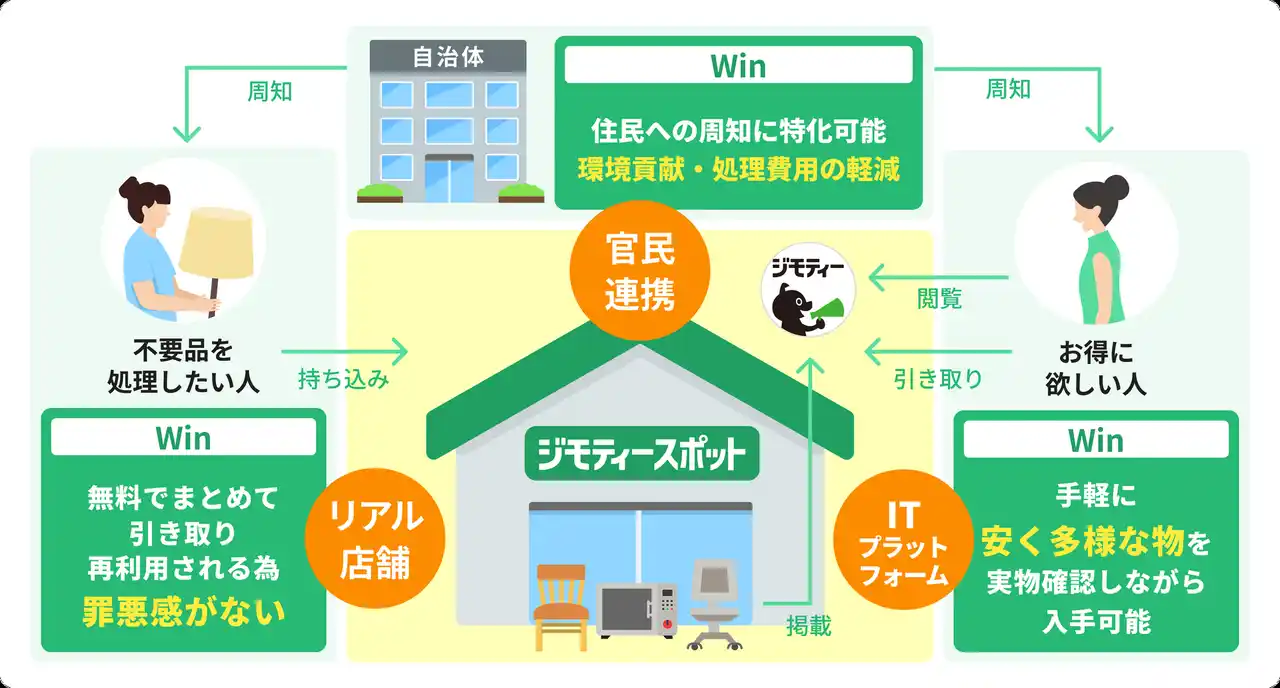 ごみ減量を目的に自治体と連携しており、地域住民へごみとして出す前にジモティースポットでリユースするように促していただいています。自治体と提携していることで、地域住民からも厚い信頼を得ながら、ごみ減量にも寄与できる社会貢献性の高い事業です。 |