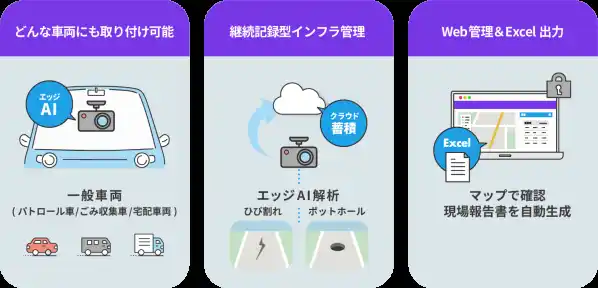 地域を日常的に巡回するパトロール車、ごみ収集車、生協などの宅配車両、飲料メーカーの自動販売機補充車などにエッジAI端末を取り付けるだけで、日常の走行がそのまま道路点検になります。ドライバーは普段どおりの運転を行うだけで、AIが5m間隔で路面を解析し、データは自動でクラウドに蓄積されます。専用機材の手配や撮影作業も不要です。
