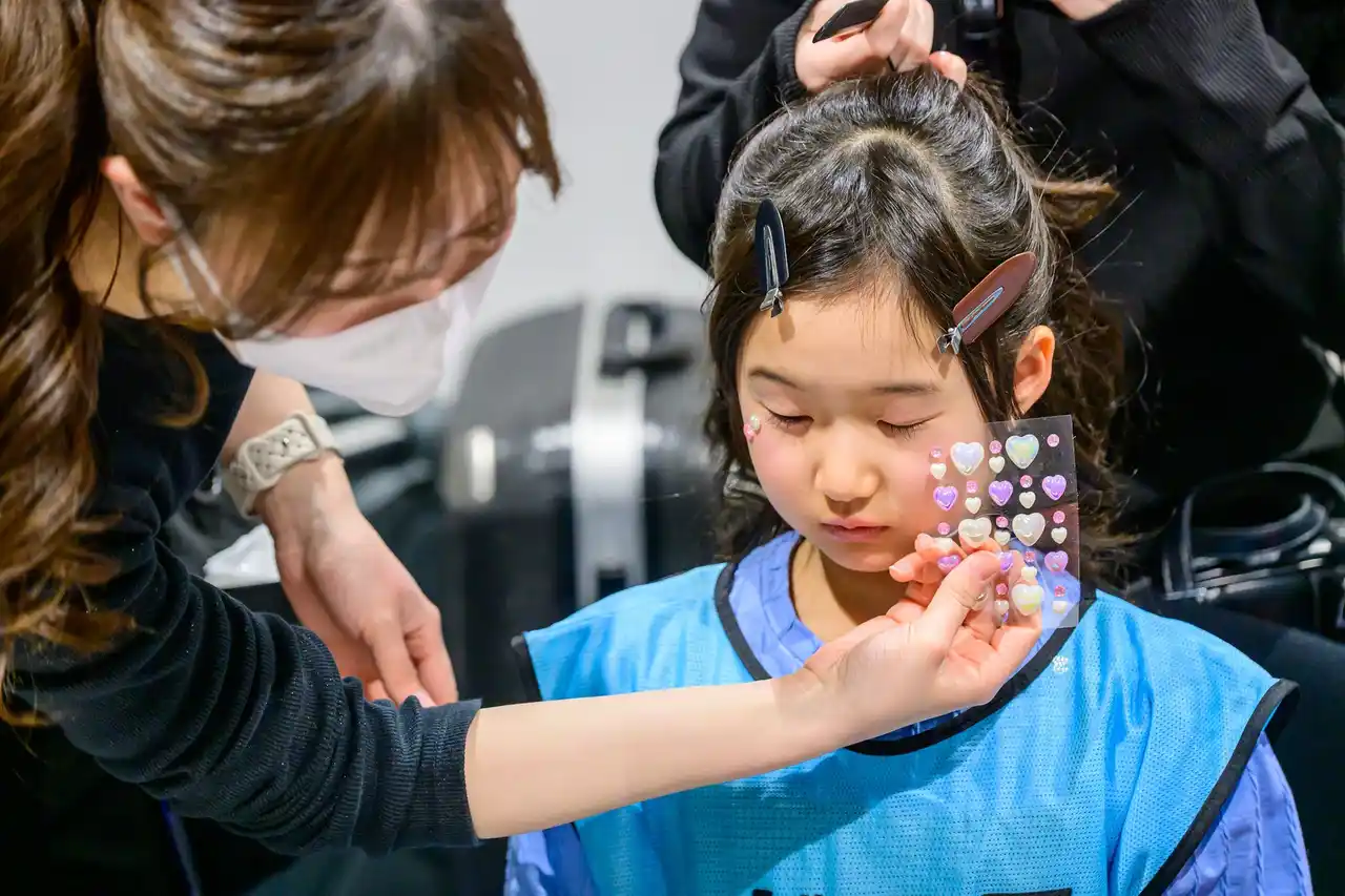 へアメイク体験では、子どもたちの「こんなスタイルにしたい!」というリクエストに応えつつ、ヘアメイクの方に骨格やパーツなどの個性を生かしたステージ映えするプロのヘアメイクを施していただきました。プロの手によってメイクアップされた自らの姿に感動して、「リップのプルプル感と髪のキラキラがお気に入り!」「普段も少しメイクするけど、今日は大人っぽくしてもらった!」と目を輝かせる子どもたちが印象的でした。 |