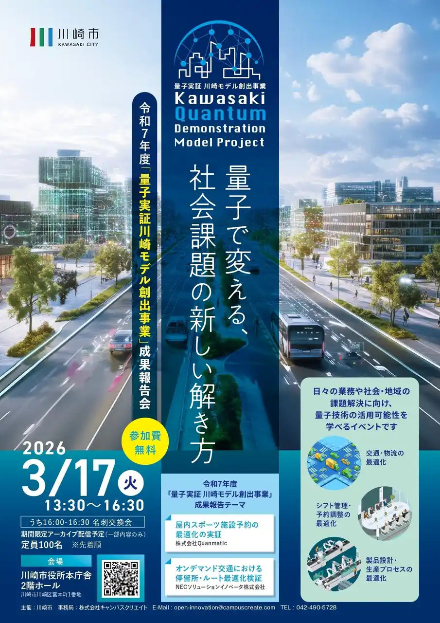 ■開催趣旨 川崎市では、量子コンピューティング技術を活用し、地域課題・行政課題に挑む「量子実証 川崎モデル創出事業」を推進しています。 |