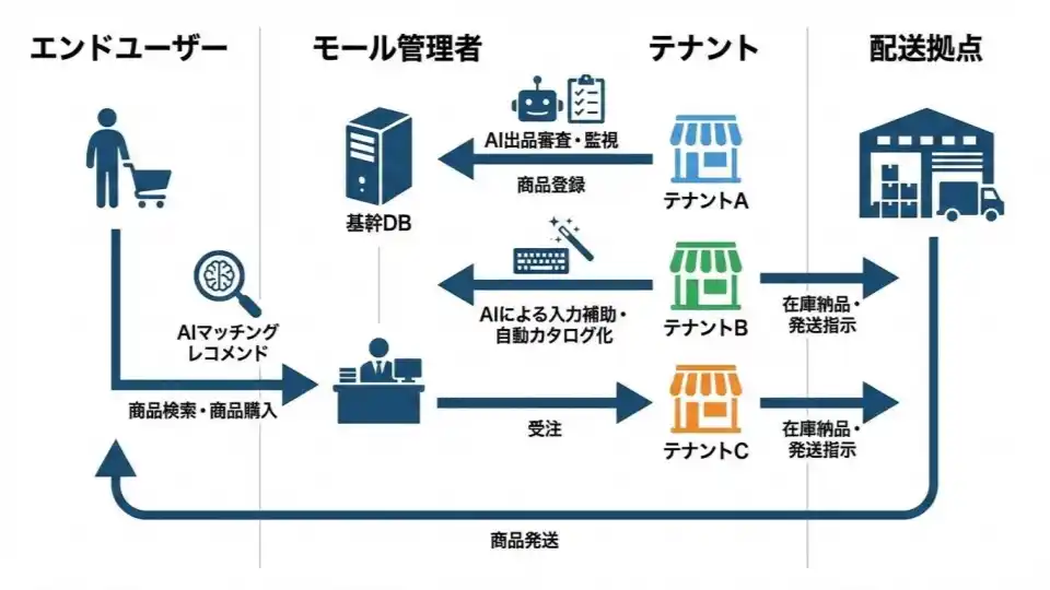 AIマッチングレコメンド: 買い手(ユーザー)の行動履歴と、売り手(テナント)の商品・サービス特性をAIが分析し、最適なマッチングを実現。 |