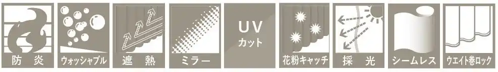 「どれを選べばいいかわからない」「機能も見た目も、全部あきらめたくない」という声に応える、万能な「超多機能」シリーズです。防炎・ウォッシャブル・遮熱・ミラー・UVカット・花粉キャッチ・採光・シームレス・ウェイト巻ロックの9つの機能を1枚に凝縮しました。 |