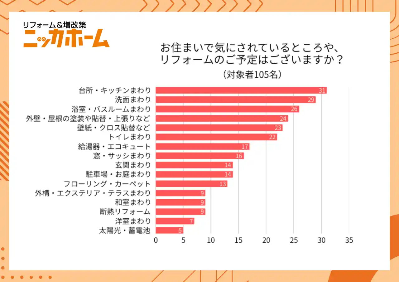 「お住まいで気にされているところや、リフォームのご予定はございますか?」の質問に対し、105名*の方に複数回答可の「リフォーム検討部位」のアンケートを実施した結果によると「台所・キッチンまわり」を検討いただいている方が共にもっとも多く31名、次いで「洗面まわり」を検討いただいている方が29名でした。 |
