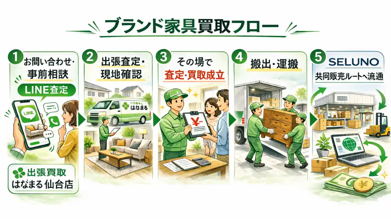 さらに、ブランド家具専門卸・販売事業者「SELUNO」との共同販売ルートを活用し、個人利用品から法人オフィス什器まで対応可能な高価買取体制を整備いたしました。 |