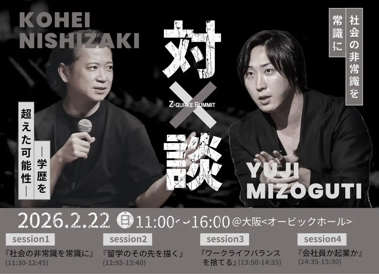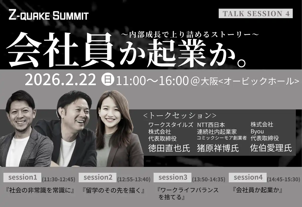 | 株式会社HINODE(大阪府大阪市 代表取締役:淀澤伸之)は、“関西Z世代底上げキャリアイベント『Z-QUAKE SUMMIT Vol.3』(以下ゼトクエ)を2026年2月22日(日)、オービックホール(大阪市中央区平野町4-2-3)にて開催いたします。 各業界トップランナー起業家のトークセッションや、Z世代によるピッチ、優良企業との交流ブースなど。 | |||||||||||||||||