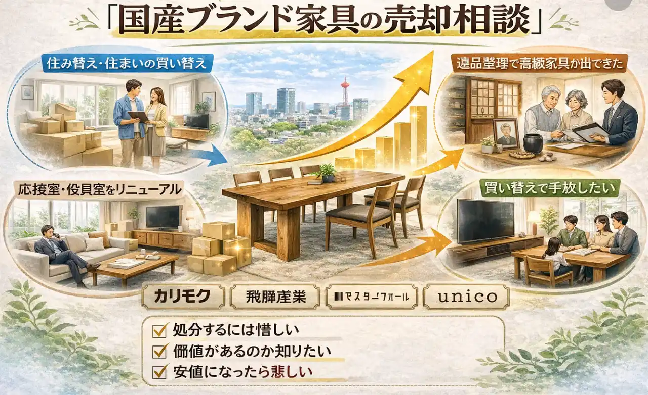 千葉県では近年、住み替えやマンション購入、実家の整理・遺品整理、法人応接室の改装、家具の買い替えを背景に、高品質な国産家具の売却相談が増加しています。 |