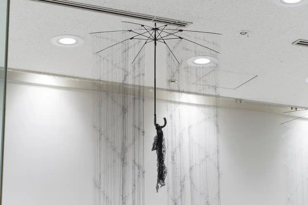 今回の展示「気配這う」では、新作や公開制作を含む傘の作品群に、作家親族の旧家に残されていた織り機、そして家族が撮影した記念写真をもとにした作品を加えて構成されます。 あわせて、当館エントランスホールおよび旧テレフォンブースでも関連作品を展示しています。 |