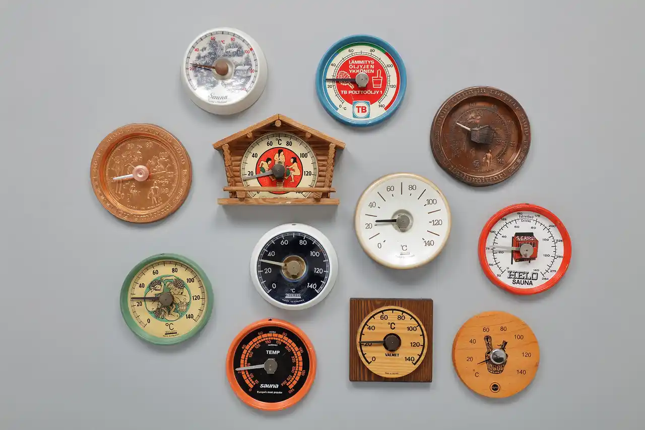 その時間を演出するのが、デザインされたさまざまな道具です。美しく手入れされた白樺のヴィヒタ、伝統的な木製の桶やひしゃく、そして代々受け継がれてきたサウナストーブ。ほかにもマグカップや温度計、サウナハットにいたるまで、約130点を展示します。 |