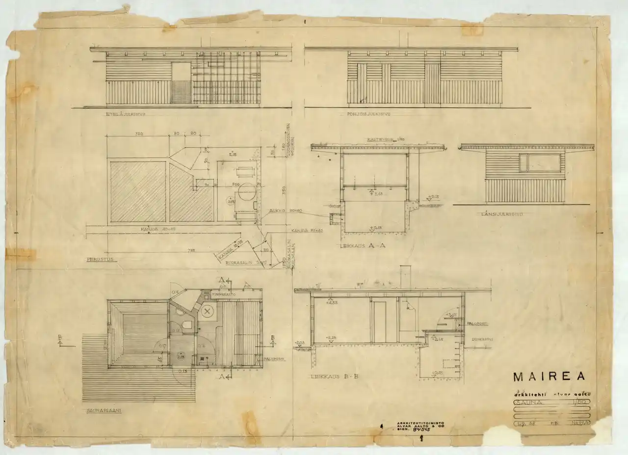 サウナの平面・立面・断面図 作図=アルヴァ・アアルト、1938、アルヴァ・アアルト財団蔵 |
