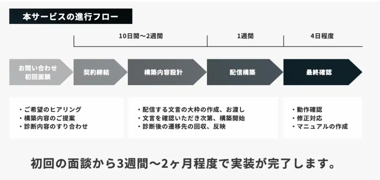 ・アカウント設計 ・ステップ配信設定 ・タグ設計 ・自動応答設定 ・リッチメニュー構築 ・簡易販売導線の設計 |