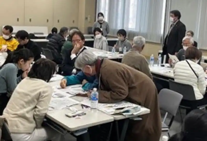 後半は、本学の山崎淳一郎特定教授の指導の下、ワークショップ「4コマ漫画教材~もしもあなたが避難所にいたら?~」を開催。避難所で実際に起こる困った状況(1~3コマ)について、皆が納得できる説明(4コマ目)を考えるという、避難所運営のシミュレーションゲームです。参加者は5つのグループに分かれ、それぞれに避難所で困りごとについて、実際の震災で起こった事例も交えながら話し合いました。その中では、地域の方の防災への取り組み、学生目線の意見など、活発なやり取りが生まれ、終始和気あいあいとした雰囲気で避難所での生活について考えることができました。 |