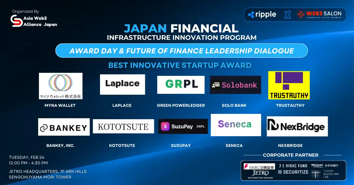 | 2026年1月から実施している「日本金融インフライノベーションプログラム(JFIIP)」は、スタートアップ、規制当局、機関パートナーが集結し、日本から世界へ次世代の分散型金融(DeFi)とフィンテックの社会実装を加速させるプロジェクトです。 | ||||||||||||||||||||||||||||||