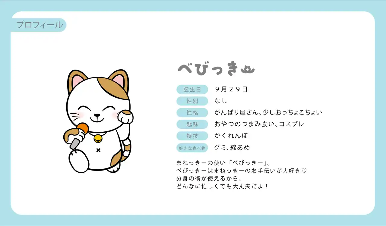 国内店舗数最大手のカラオケチェーン「カラオケまねきねこ」 に、新しい仲間が加わりました。新公式キャラクターの名前は「べびっきー」。「まねっきー」と一緒に皆様に笑顔をお届けできるよう一生懸命頑張ります。 |