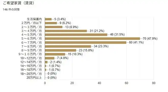 賃貸の場合、5~6万円の回答が47.9%と最も高く、ついで6~7万円が41.1%となっている(図8参照)。 |