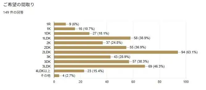 次に希望される間取については2LDKが最も高く全体の63.1%で次いで3LDKが46.3%という回答を得ている(図9参照)。 |