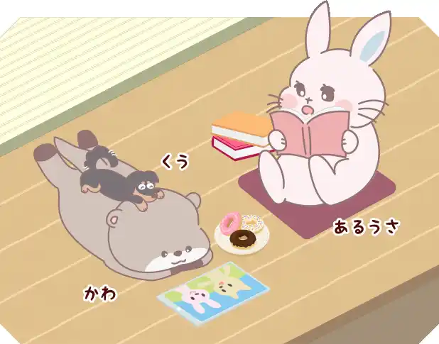 あるうさは、創作品モール「あるる」のメインキャラクターです。 お友達のかわちゃんやペットのくうちゃんとともに |