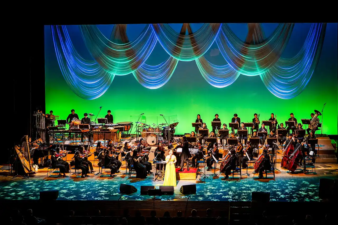 コンサートが始まると、平原は「おひさま~大切なあなたへ」で会場を包み込むような歌声を聴かせる。2024年から引き続きタッグを組んでいる洗足学園ニューフィルハーモニック管弦楽団の演奏が平原の優しく力強い歌声に寄り添い、見事なハーモニーを奏でていた。他にも、平原の多彩な歌声を味わうことができる「The Sound Of Music Medley」、ボイスパーカッションが印象的な「アランフェス協奏曲~Spain」など、歌手としてのスキルの高さで観客を楽しませる。 |