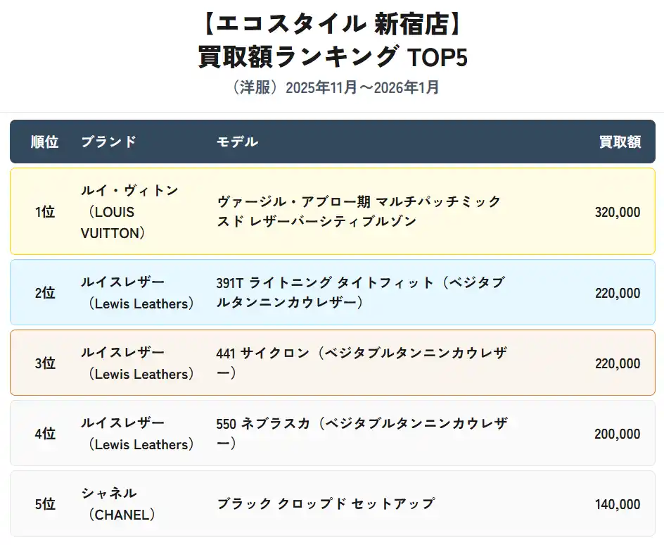 買取額ランキング TOP5 (洋服/2025年11月~2026年1月・新宿店) |