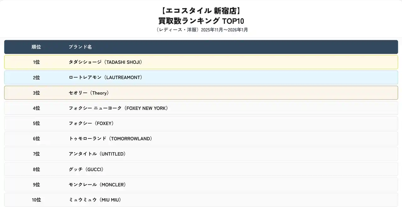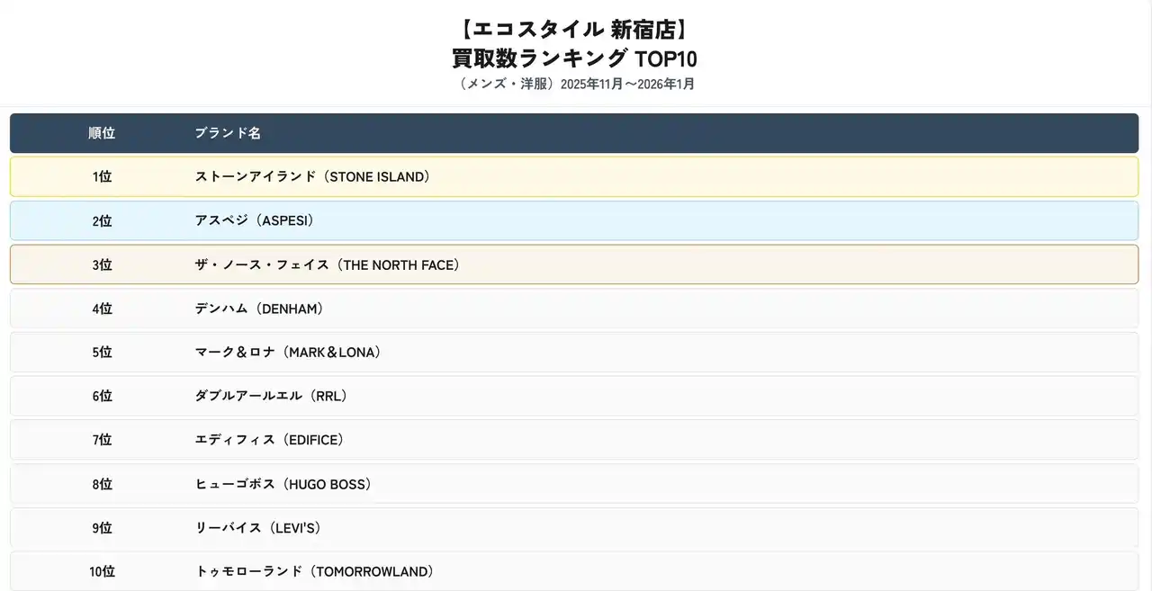 | 株式会社スタンディングポイント(本社:東京都目黒区、代表取締役:若森 寛)が運営するブランド買取専門店「エコスタイル新宿店」は、2025年11月から2026年1月における洋服の買取実績をもとに、ブランド別ランキングを集計・発表しました。本リリースでは、メンズ・レディースそれぞれの買取数ランキングTOP10に加え、期間中の買取額ランキングTOP5を公開し、新宿エリアにおけるファッションリユース市場の最新動向をお知らせします。 | |||