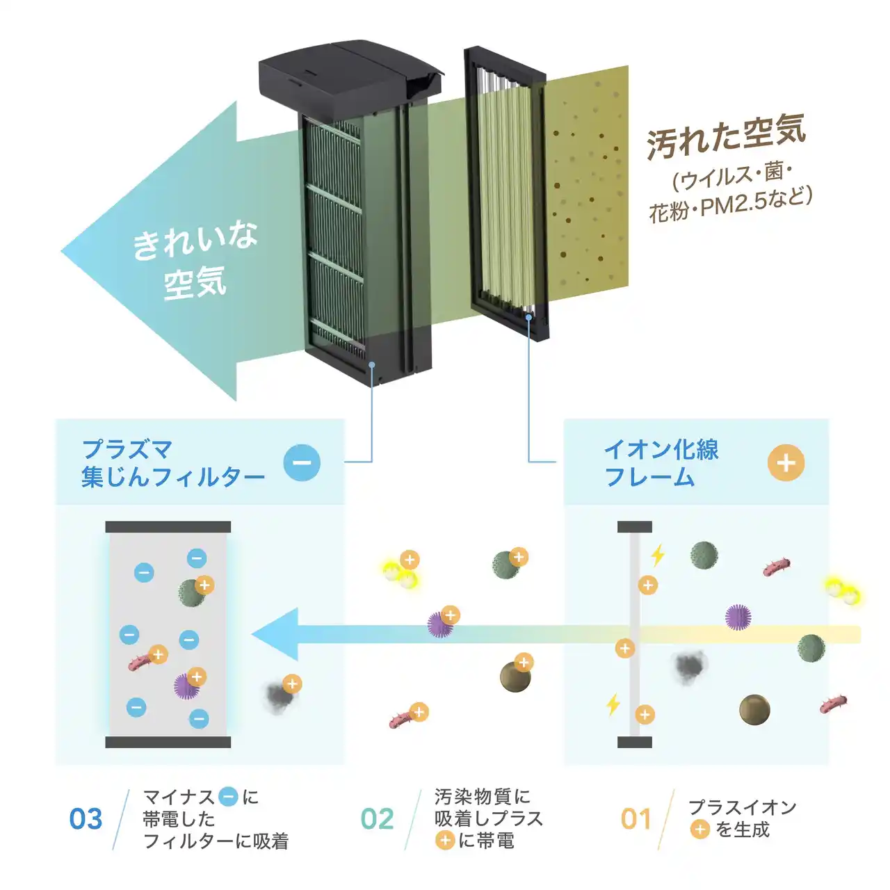 | 静電気の力で有害物質を99%以上除去(※1)する「プラズマ集じんフィルター」を採用。目詰まりしにくく、水洗いで集じん性能が再生するため、フィルター交換のコストと手間を大幅に削減します。常に清潔な状態で、高い清浄力を維持できるのが特徴です。 | |||||||||||||||||||