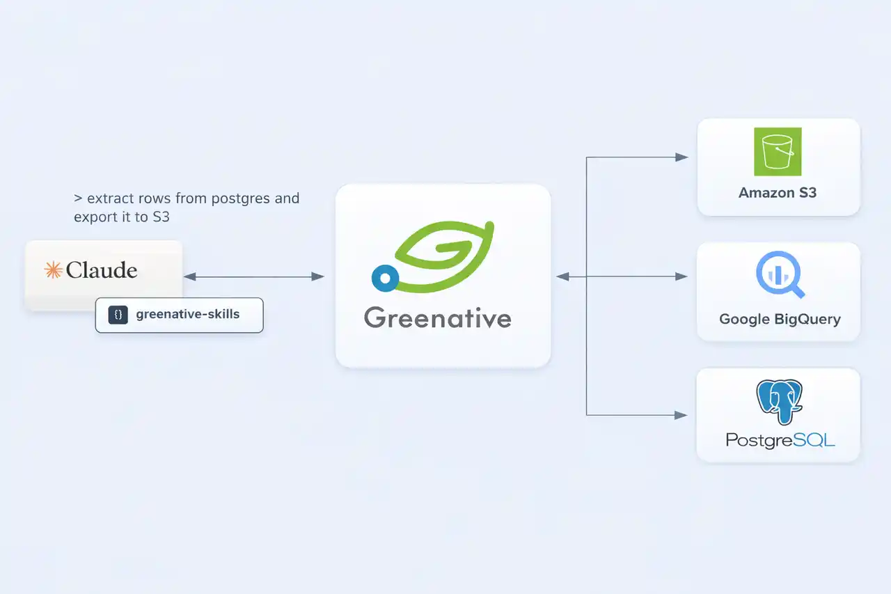 近年、AI コーディングエージェントは急速に進化し、開発体験は大きく変化しています。一方で、生成されたコードを実際のデータ基盤やクラウド環境に連携させ、実行するための仕組みは依然として重要な課題です。Greenative では、AI エージェントと企業データ基盤を接続する実行レイヤーの整備を進めています。 greenative-skills は、Claude Code から Greenative Platform を呼び出すための軽量な拡張モジュールです。これにより、ユーザーからの自然言語による指示をもとに AI エージェントは、データ抽出・変換・保存・API 実行などの処理を Greenative Platform 上で実行することが可能になります。 |