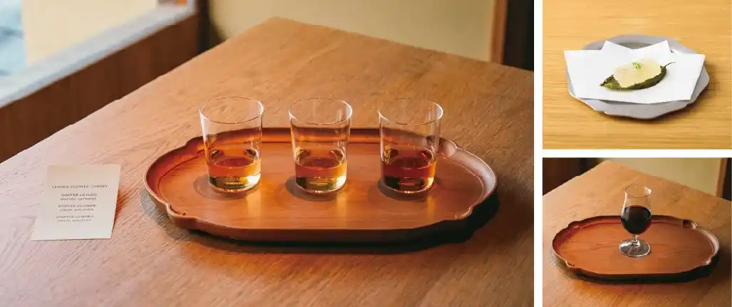 コースの幕開けには、コーヒーノキの葉・花・果実を用いたオリジナルドリンクをご提供し、普段は味わうことの少ないコーヒー植物の多様な魅力をご紹介します。続いて、自社でローストから結晶化までを手がけたエクセルサ種のインスタントコーヒーや、産地ごとの個性が際立つリベリカ種・エクセルサ種の飲み比べなど、未来のコーヒーを多角的にご体験いただけます。日本の喫茶文化に着想を得たネルドリップの濃厚な一杯、そしてスパイスを合わせたダイジェスティフでコースを締めくくります。 |