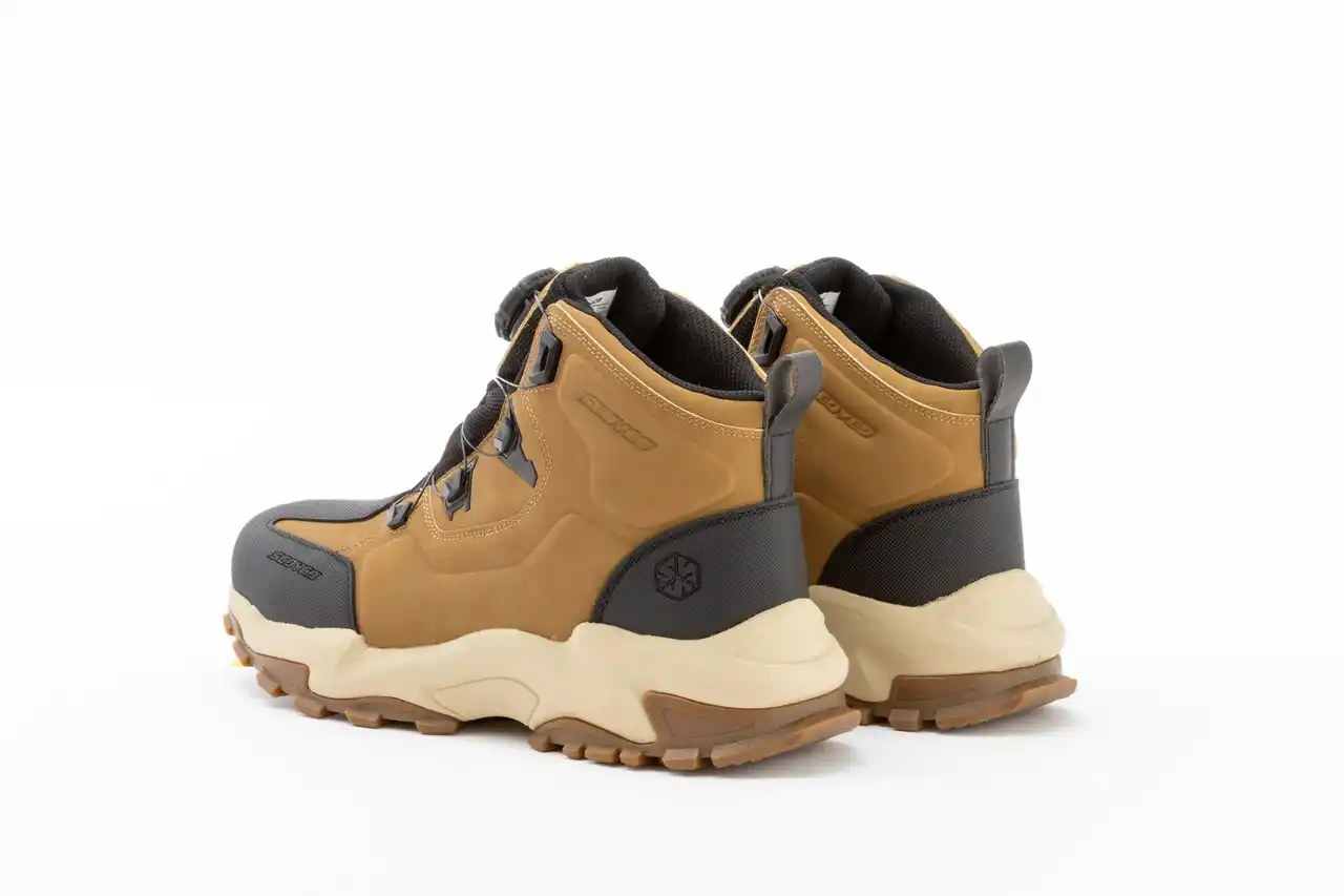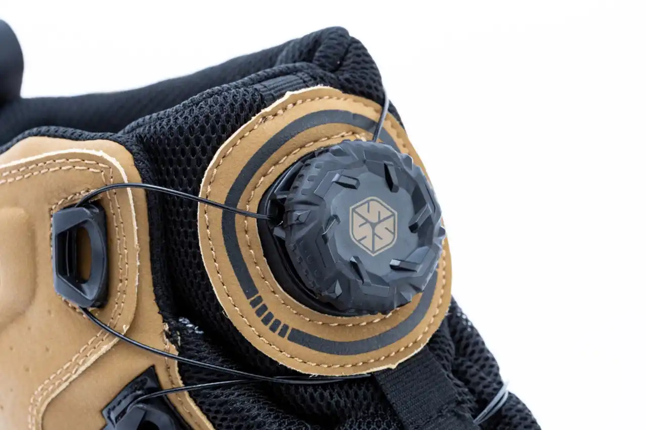 シューレースは脱ぎ履き容易なダイヤル式を採用。ダイヤルはオフロードタイヤのようなワイルドな形状となり、スポーツシューズに使われているよりも厚みがあります。 |