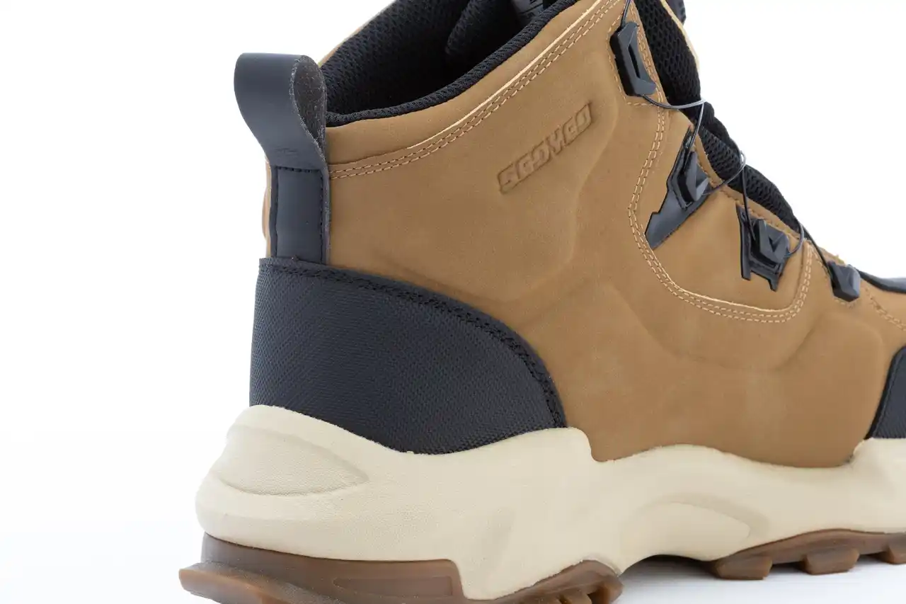 シューズのグリップ性を左右するアウトソールは凹凸の大きなラグソール。かかとの部分は大きく後ろまでカバーする形状で、デザイン上の大きなアクセントともなっています。 |
