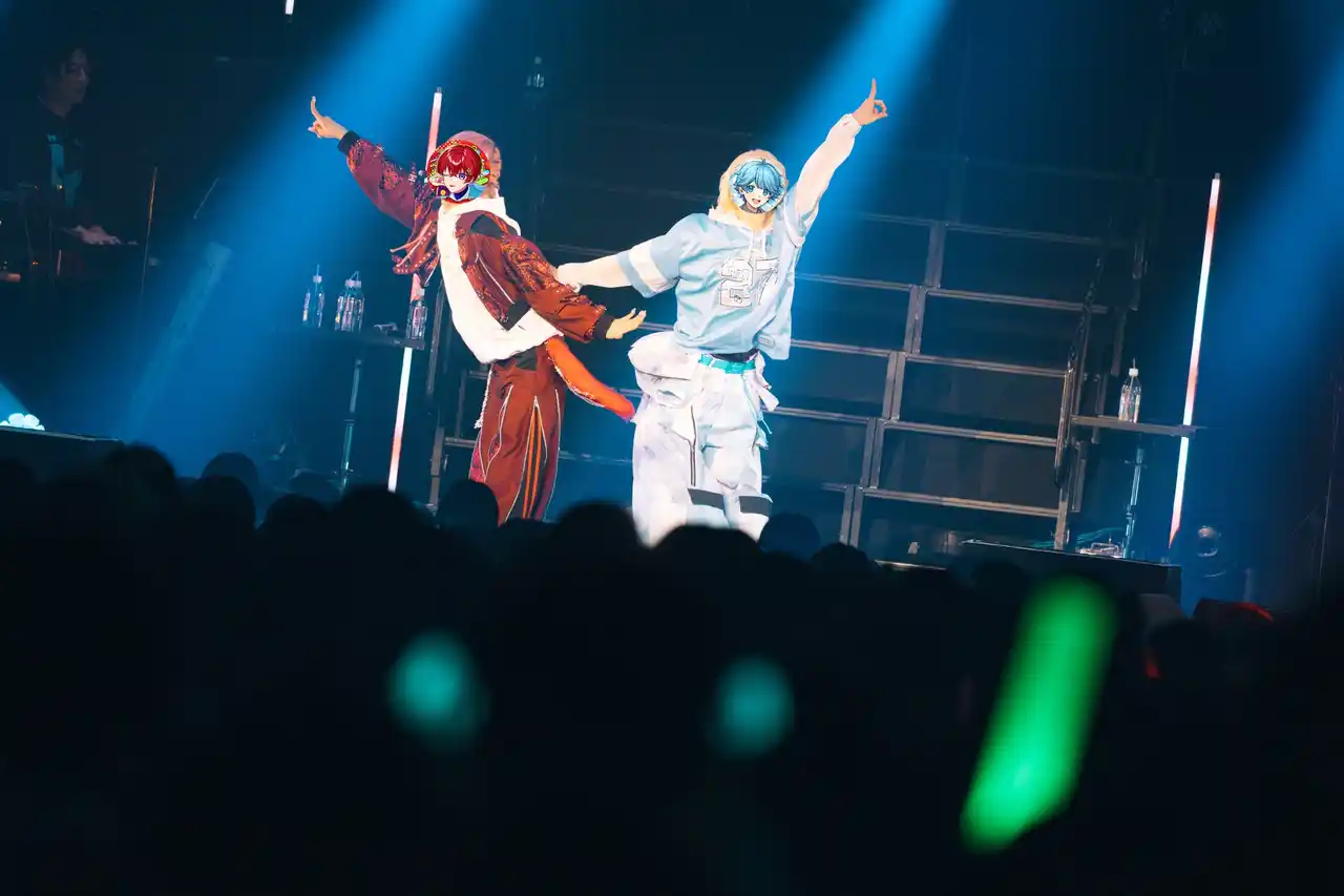 ここで突如として、ガチャを回すVTRが投下される。なんの前振りなのかと客席がざわめいたのも束の間、なんと「Coe. (すたぽら) 参戦」が告げられた。想像の斜め上を行く展開に、たちまち会場は大熱狂へ。「超次元LOVE理論→→→」をパフォーマンスするふたりの暴力的な可愛さたるや。可愛いが掛け合わさることで生まれる無限の可能性を、まざまざと物語る。さらには「チューリングラブ」もドロップし、息のあったステージで観客を釘付けにしたのだった。 |