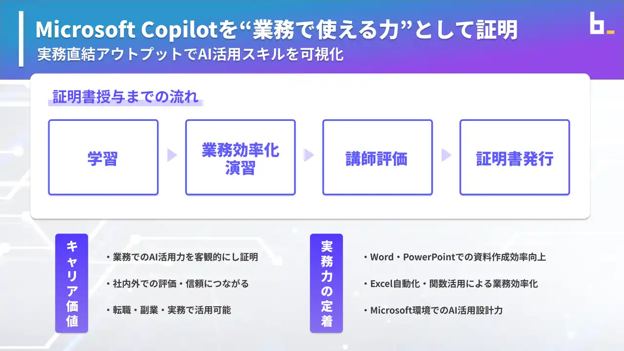 これにより、 「Copilotが使える」ではなく、 「Copilotを使って、どのような業務成果を出せるか」 を 第三者にも伝えられる形で証明することが可能です。 |