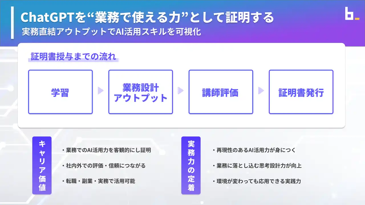 | ChatGPT スキル証明書を取得することで、受講生は以下のような実務・キャリア面での効果を得ることができます。 | ||||||||||||||