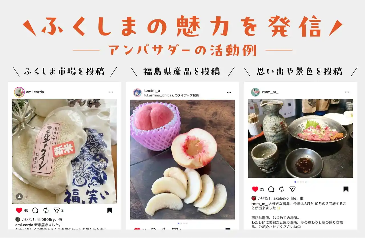アンバサダーには、ふくしま市場で取り扱う県産品をはじめ、福島県内の観光地や地域イベントの魅力を、写真や動画とともにSNSで発信していただきました。投稿には「行ってみたい」「美味しそう」「知らなかった!」といった反響が寄せられ、多くの方に福島の魅力を届けることができました。 |