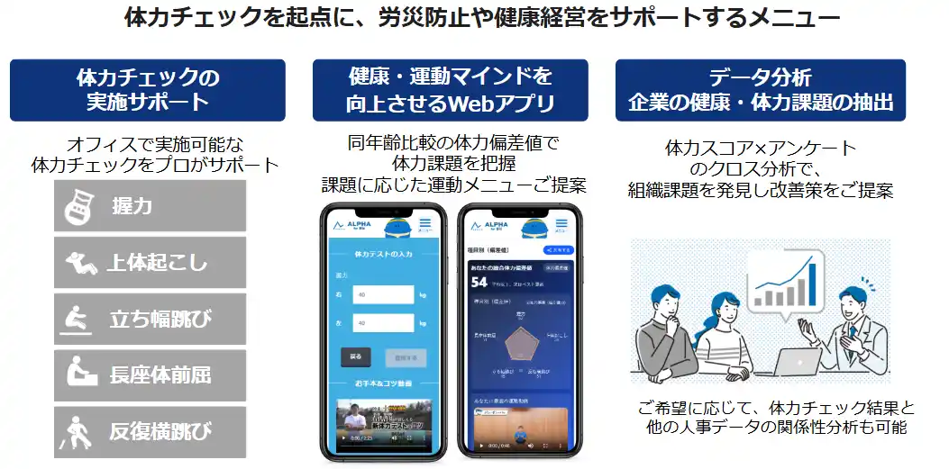 | ALPHA for Bizは、従業員の健康・体力課題をデータで可視化することで健康・運動に対するマインドを高め、労災防止や健康経営の取り組みをサポートするサービスです。具体的には以下3つのサービスで構成されています。 | |||