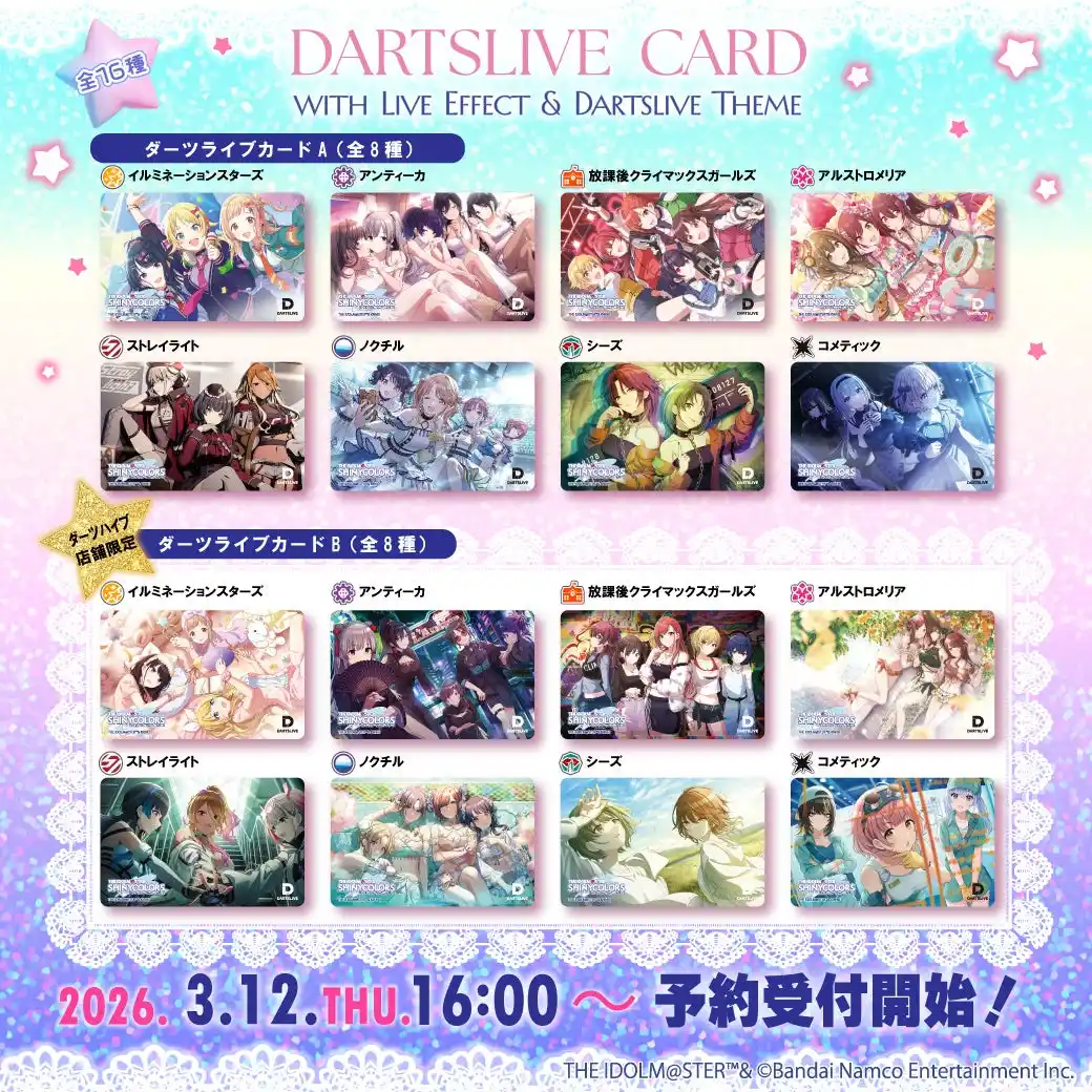 セガサミーグループの株式会社ダーツライブ(本社:東京都品川区、代表取締役 社長執行役員:阿部 東)と株式会社ハイブクリエーション(本社:宮城県仙台市、代表取締役:齋藤 俊彦)は、「アイドルマスター シャイニーカラーズ」とコラボレーションした様々なコラボ企画を2026年3月12日(木)よりスタートいたします。詳細は以下となります。 |