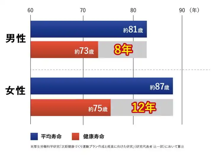 また、日本は世界有数の長寿国ですが、厚生労働省が公表しているデータによれば、平均寿命と健康寿命の間にはおよそ10年前後の差があるといわれています。*2 |