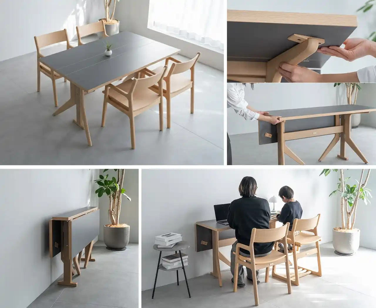 片面ずつ天板を広げることができるバタフライテーブルを中心とした暮らし。ダイニングテーブルとしてはもちろん、親子で横並びに座れる横長デスクにもなります。さらに両面を折りたためば約20cmの奥行きになるスリム設計。 |