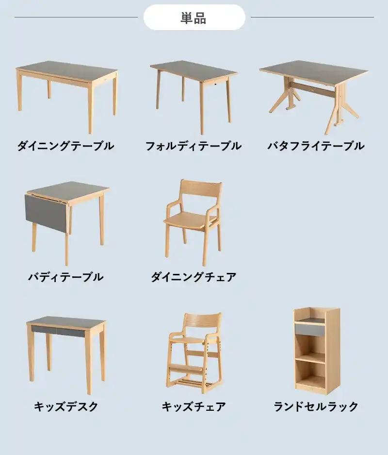 ◼️ダイニングテーブル:約幅135×奥行80×高さ72cm ◼️バタフライテーブル:約幅135×奥行85×高さ72cm 片面オープン時:約幅135×奥行52.5×高さ72cm 折りたたみ時:約幅135×奥行20×高さ72cm ◼️フォルディテーブル:約幅120×奥行60×高さ72cm 折りたたみ時:約幅120×奥行60×厚さ9.4cm ◼️バディテーブル:約幅110×奥行60×高さ72cm 折りたたみ時:約幅80×奥行60×高さ72cm ◼️ダイニングチェア:約幅49×奥行50.8×高さ79.4cm ◼️キッズデスク:約幅80×奥行45×高さ72cm ◼️キッズチェア:約幅46.6×奥行49.9×高さ79.5cm ◼️ランドセルラック:約幅42×奥行36×高さ90cm |