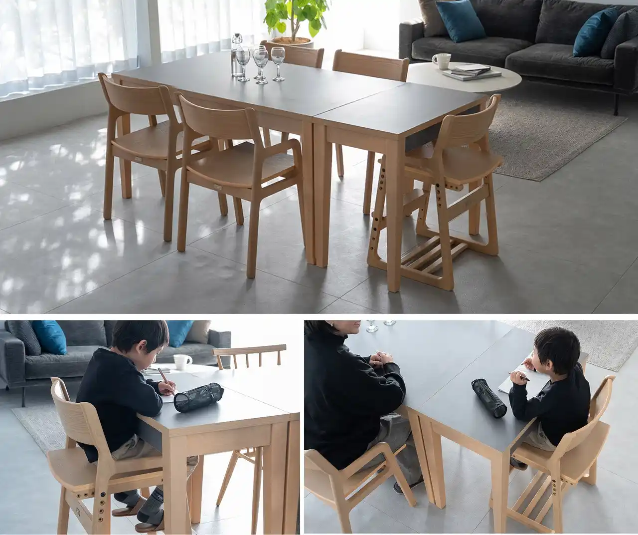子供と大人の体格の違いを人間工学設計の家具デザインでつなげることで、お互いの暮らしの境界線を取り去ります。家族が同じ空間・同じ家具で時間を共有することを大切に考えた、新しいLD(リビングダイニング)の提案です。 |