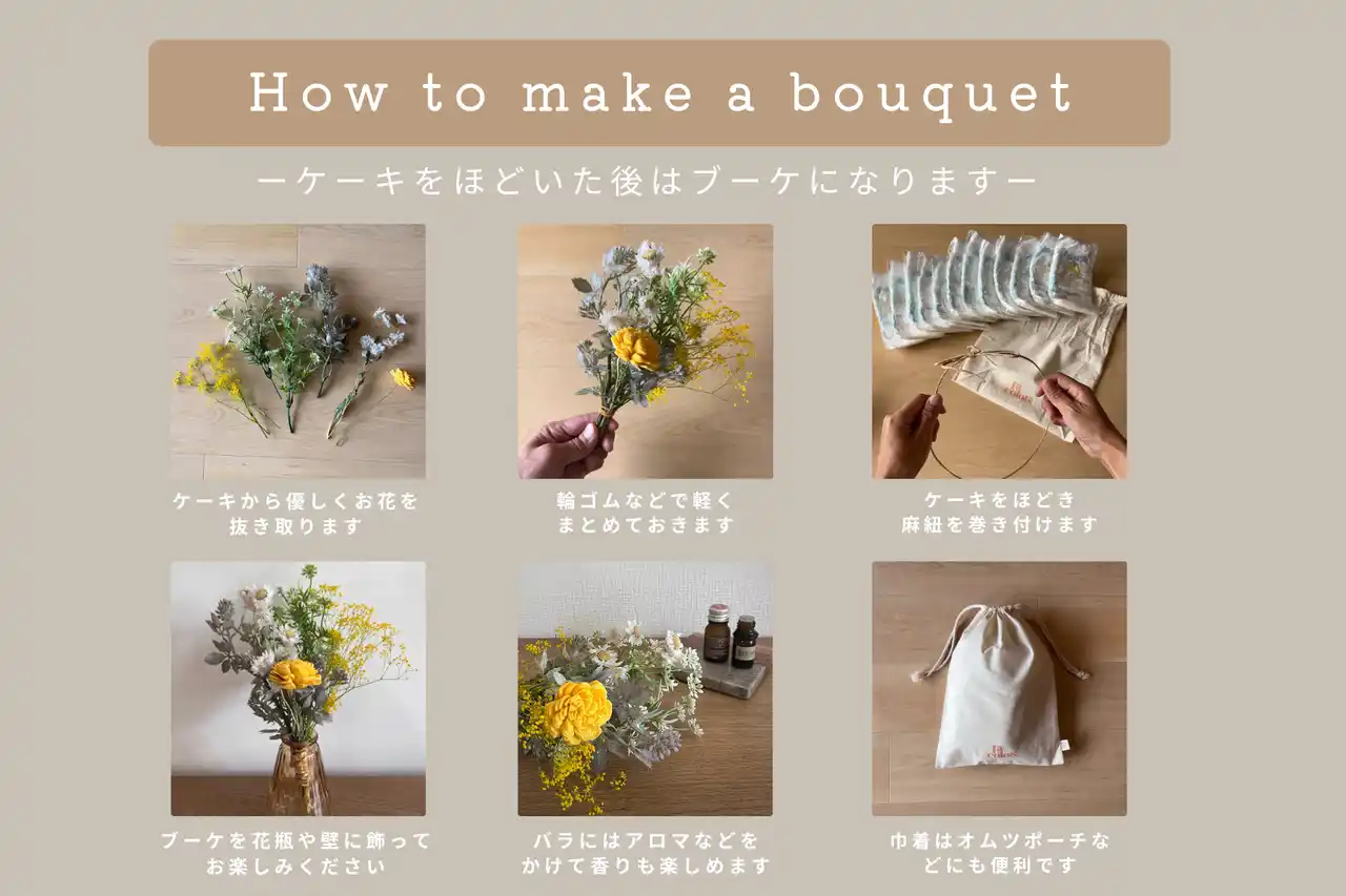 | 3. ケーキを解くとオリジナルポーチとブーケに変身。ブーケはアロマを垂らして香りを楽しめます。 | |||||||||||||||