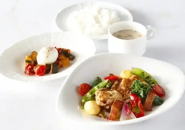 Chicken with 10 Kinds of Spring Vegetables, Honey Mustard Sauce (2,420 yen, tax included) A dish featuring a generous assortment of seasonal spring vegetables served with tender, carefully grilled chicken. The gentle sweetness and balanced tang of the honey mustard sauce enhance the natural colors and flavors of the vegetables. |