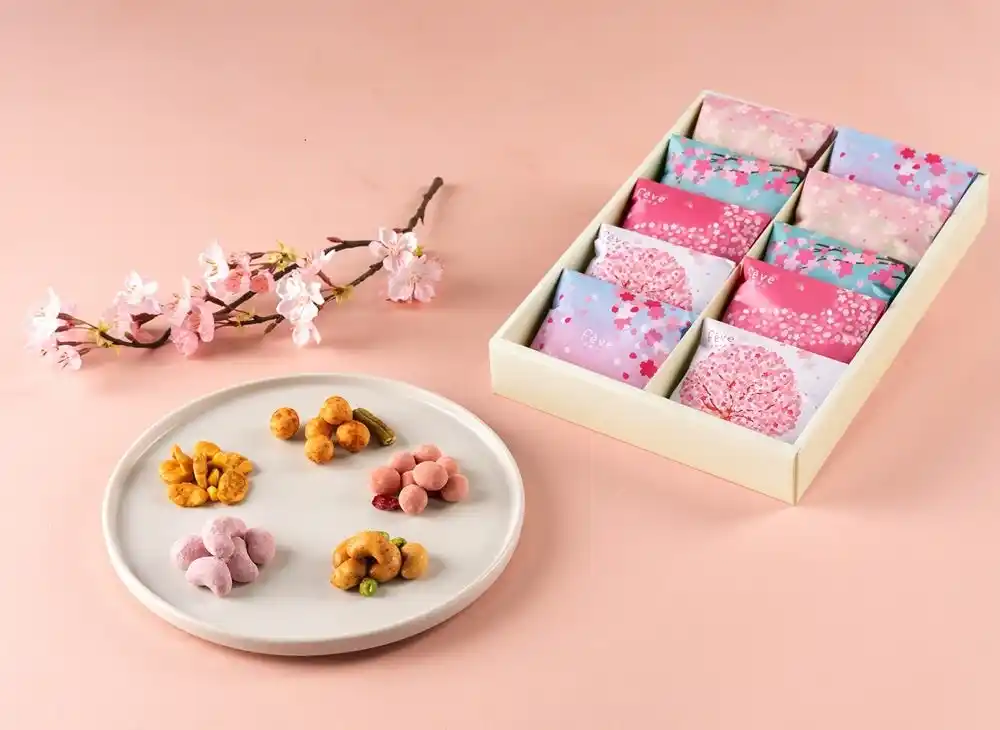 春季限定「カシューナッツ×S a k u r a 」や定番人気の「落花生×みるく」「カシューナッツ×わさび醤油」など、甘い味とおつまみ向けの味の豆スイーツ5種を爽やかな桜柄のパッケージに詰めました。 |