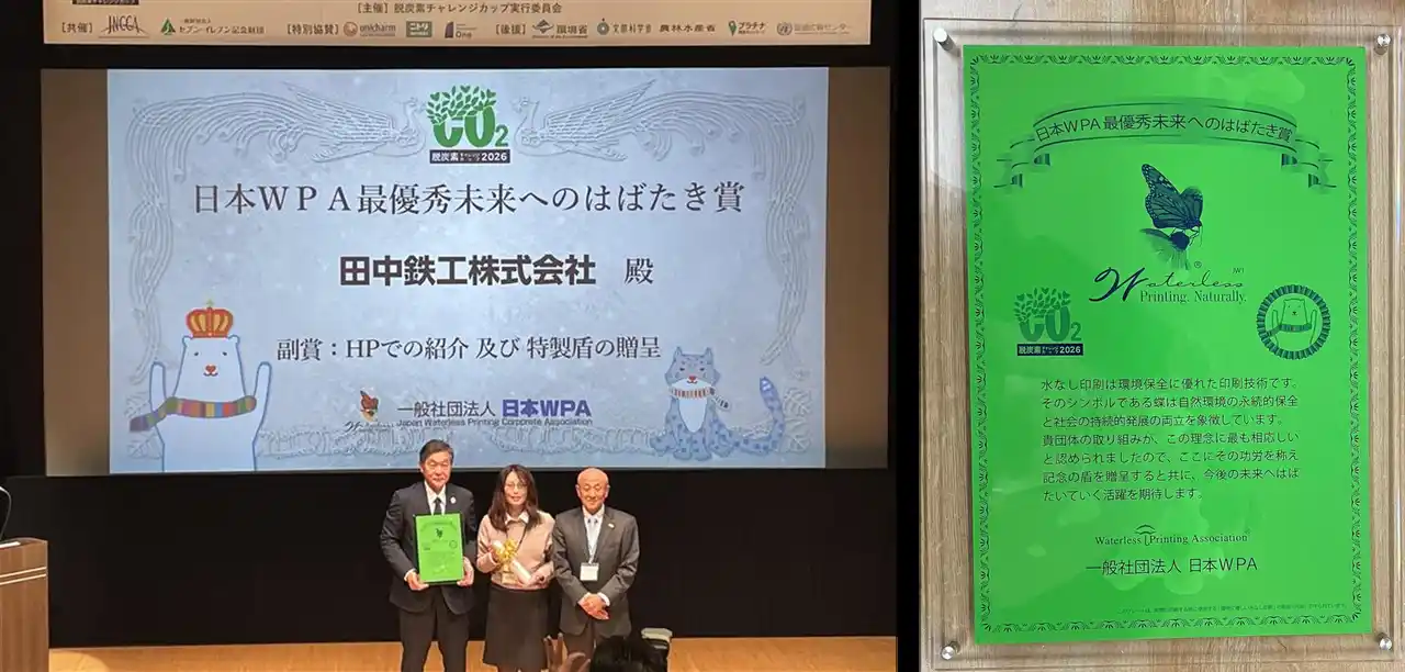 アスファルトプラントメーカー 田中鉄工株式会社(本社:佐賀県、代表取締役CEO:村田 満和)は、2026年2月20日(金)、日本科学未来館で開催された「脱炭素チャレンジカップ2026(一般社団法人地球温暖化防止全国ネット主催)」において、「日本WPA最優秀未来へのはばたき賞」を受賞しました。 |