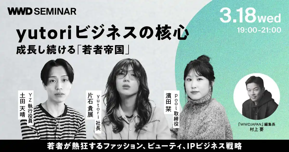 そこで今回のセミナーでは、yutoriのファッションとビューティ、IPビジネスを大解剖。片石社長をはじめ、グループの幹部社員が続々登壇し、若い世代の熱狂を集めるファッションとビューティ、IPビジネスの全貌と野望に迫ります。 |