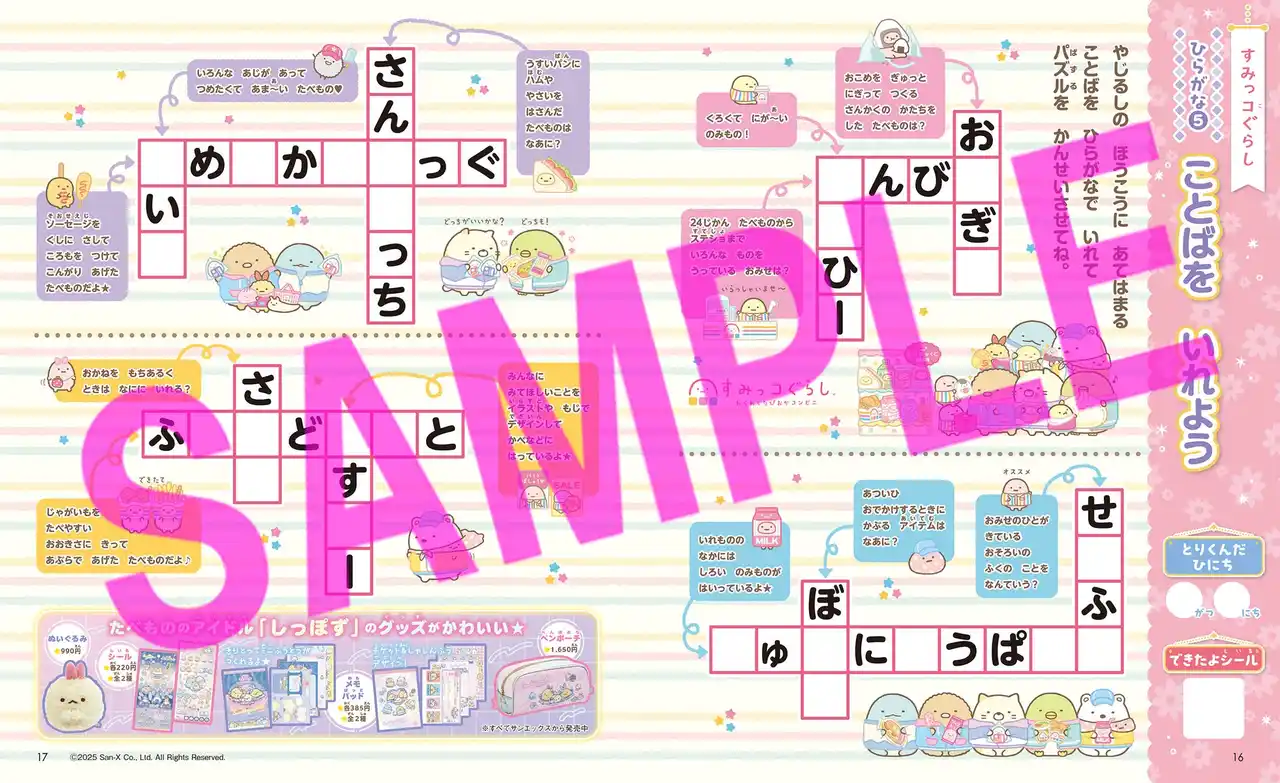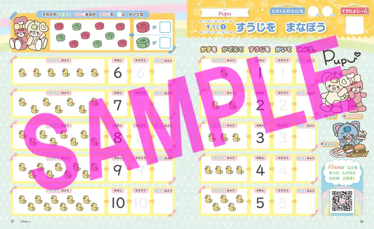 人気のキャラクターたちといっしょに学べるドリルのページは、ひらがなやカタカナ、お話の読み方、数え方、時計の読み方などが学べる大充実の内容です。 |