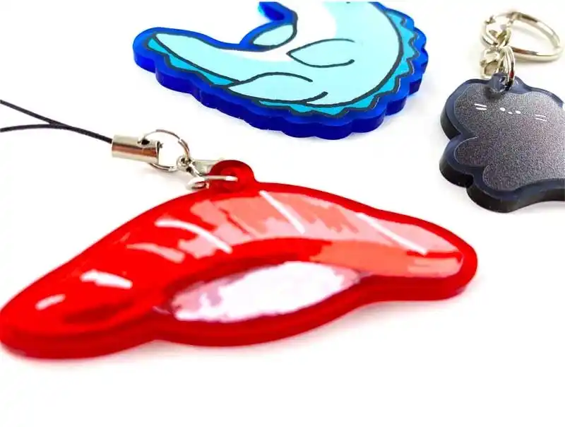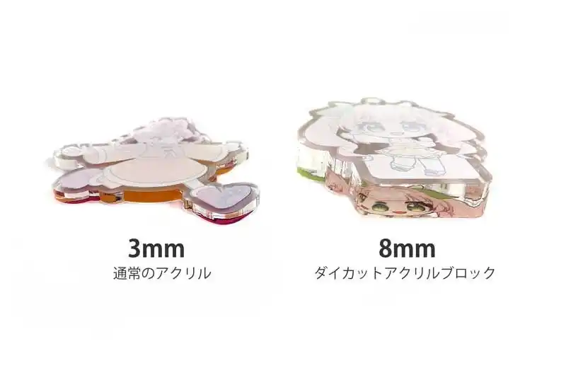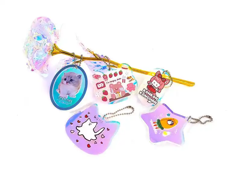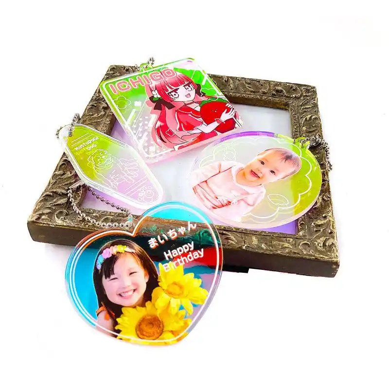 アクリルキーホルダーは、透明なアクリル板にデザインをプリントし、カット加工を施して仕上げる人気アイテム。推し活グッズや同人イベント、ショップ販促ノベルティ、記念品など幅広いシーンで活用されています。 |
