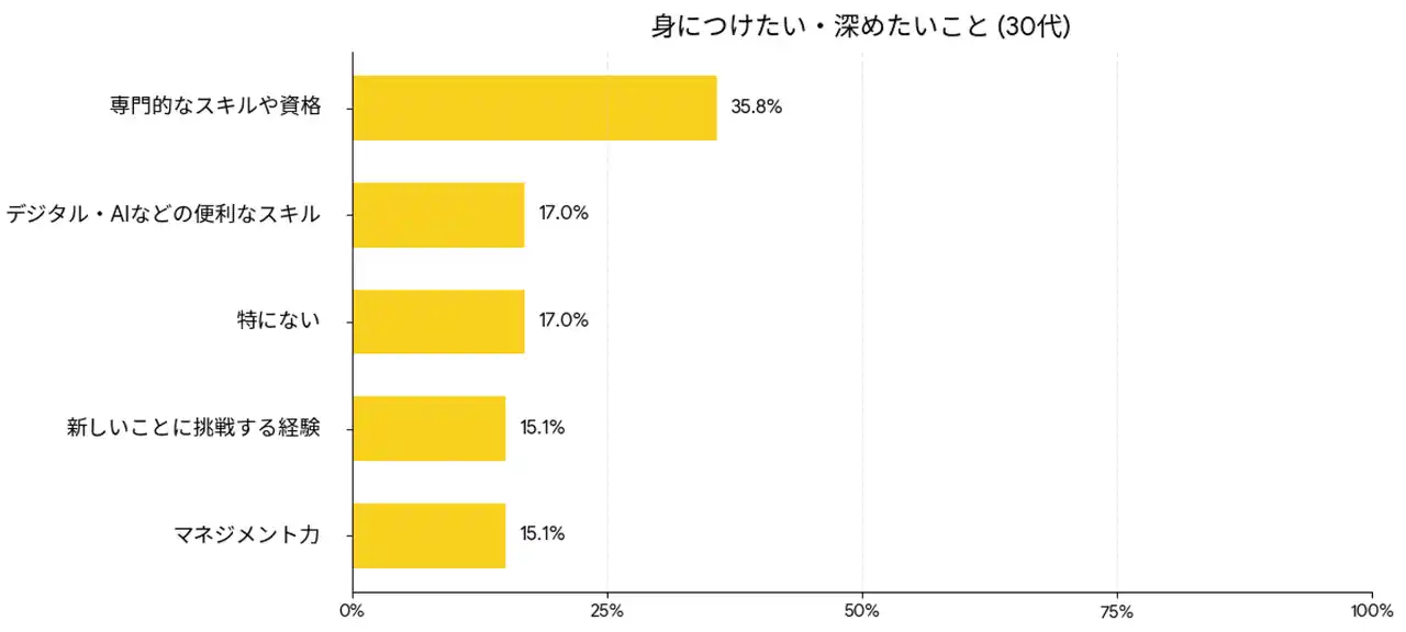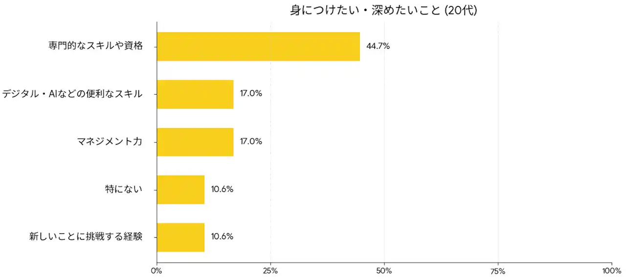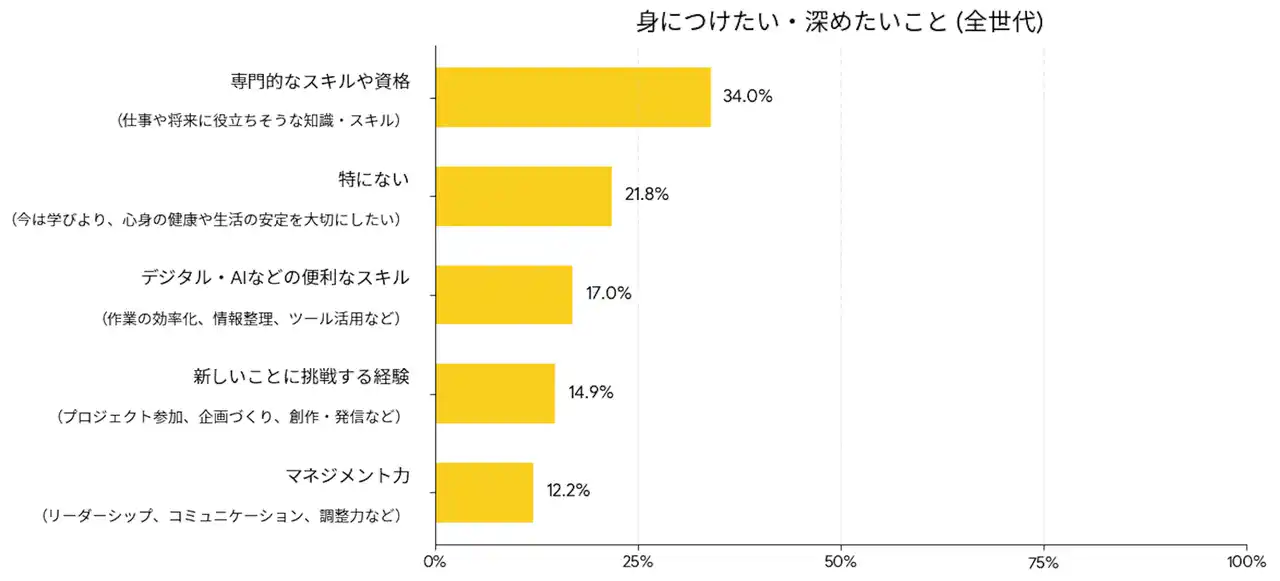 | ・「一生モノの武器」への意欲:デジタル・AIスキルやマネジメント力など、環境変化に適応できる「個の実力」を磨くことが、最大の防御であり未来への投資であるという高い意識が浮き彫りになりました。 | |||||||
