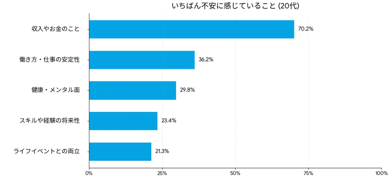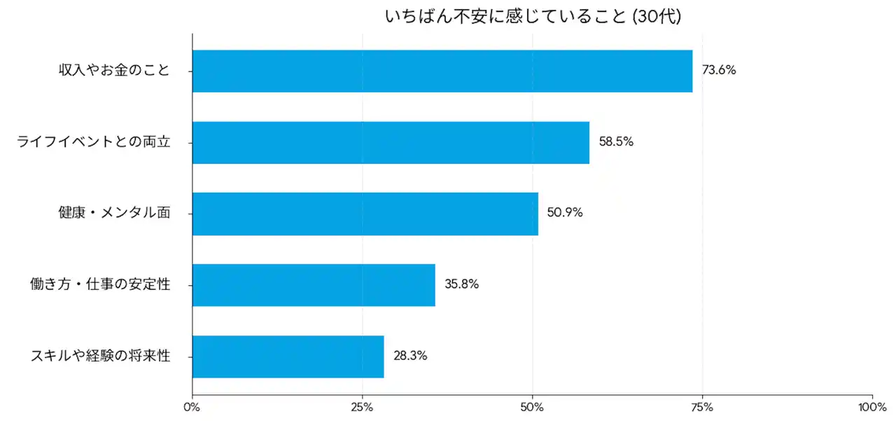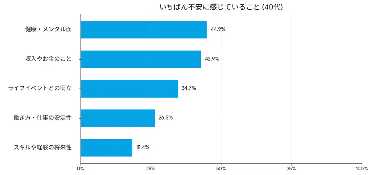 | しかし、年代別に詳細を分析すると、40代を境に不安が変化する興味深い事実が浮かび上がりました。30代までは「収入やお金(経済)」が圧倒的な1位ですが、40代になると「健康・メンタル面(体力や気力が続くか)」への不安が急増し、「収入やお金」を上回り、不安の第1位となります。 | |||||||