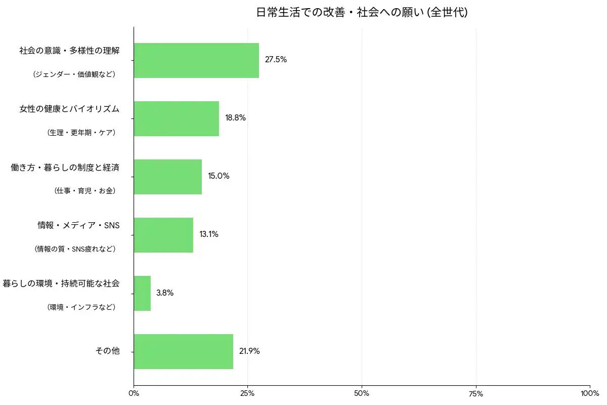 | ・「生理・更年期」への社会的理解:生理用品の負担軽減や休暇の取りやすさ、更年期の不調を気兼ねなく相談できる環境など、「女性特有の体調変化」に対するアップデートされない社会認識に限界を感じている現状があります。 | |||||||