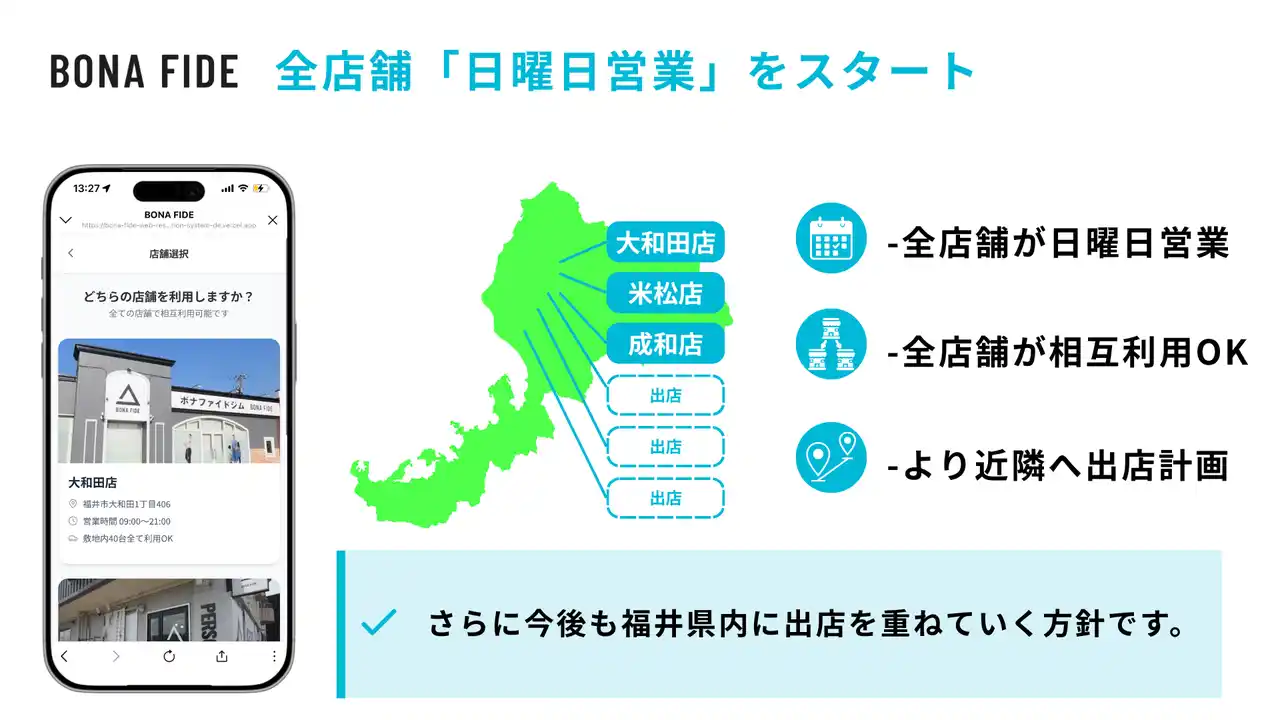 株式会社BONA FIDE(本社:福井県福井市、代表取締役:上田涼太)は、2026年3月から5月にかけてボナファイドジム3店舗で「段階的アップデート計画」を実行いたします。 |